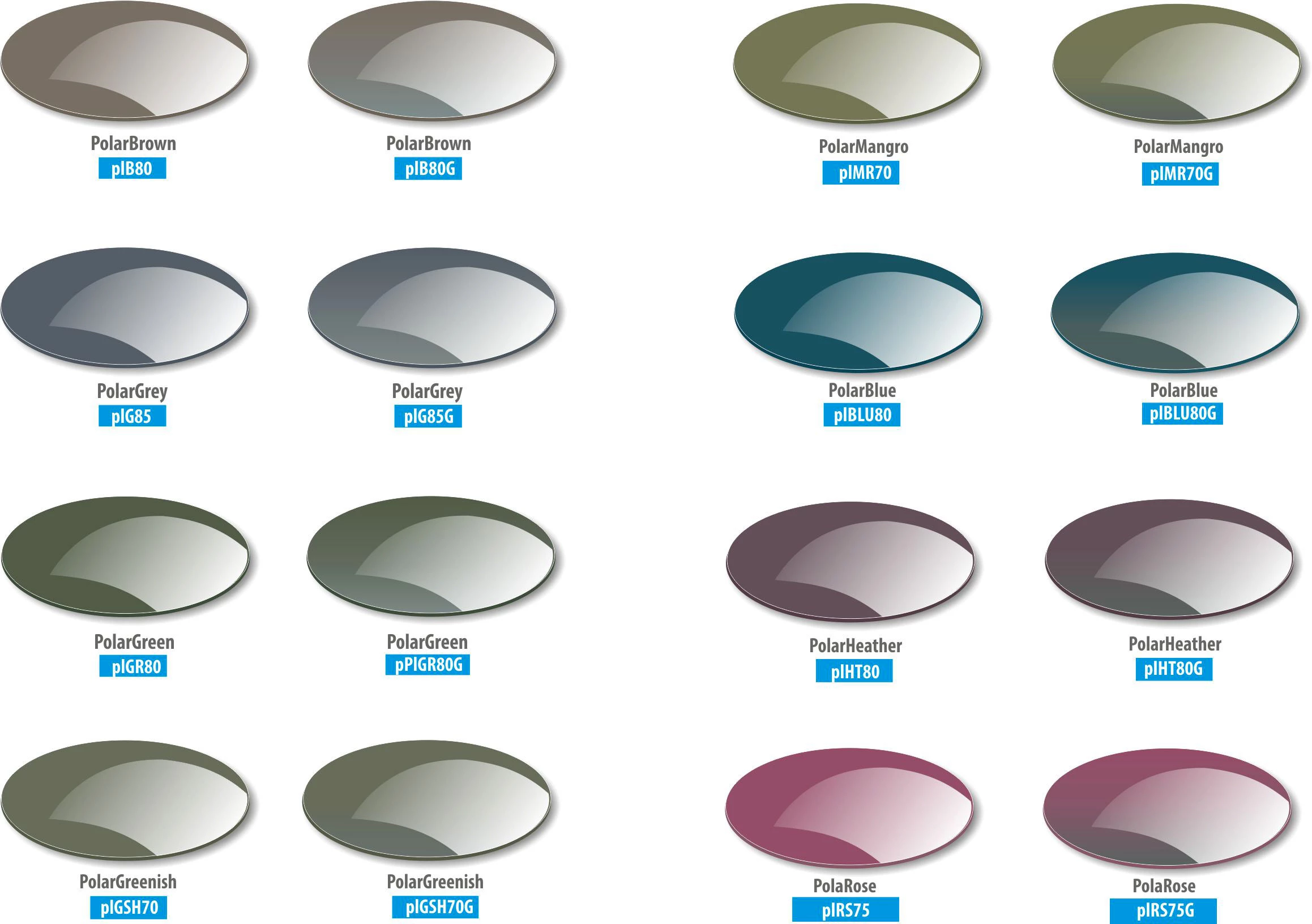 Традиционные цвета поляризационных линз серый, коричневый и зеленый, а с использованием специального спектрального фильтра можно выбрать цвет линзы с учетом индивидуальных особенностей.