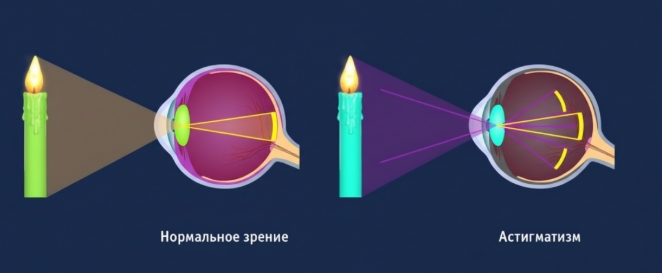 Астигматизм — это рефракционная аномалия глаза, при которой роговица или хрусталик имеют неодинаковую кривизну в разных меридианах. В результате световые лучи фокусируются не в одной точке на сетчатке, а в виде растянутого пятна или линий, что дает искажение и размытость изображения на любых расстояниях.